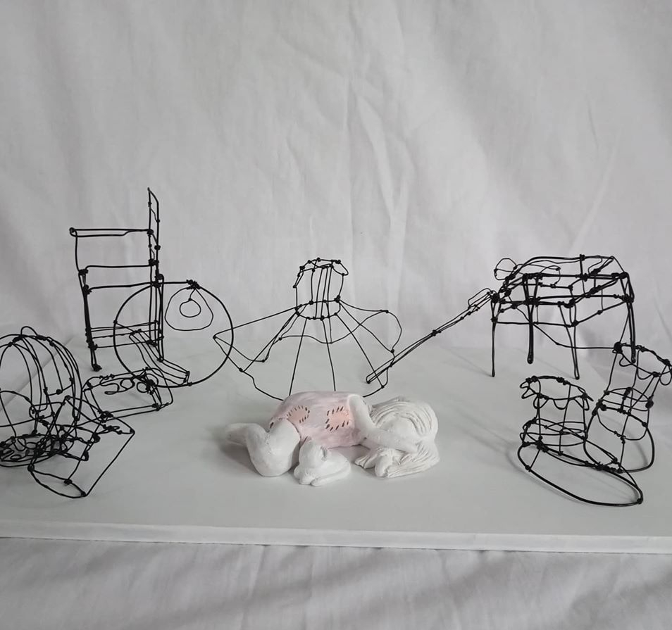 Dream:home. Polymer clay and acrylic, wire and automotive paint, wooden base. December 2019.