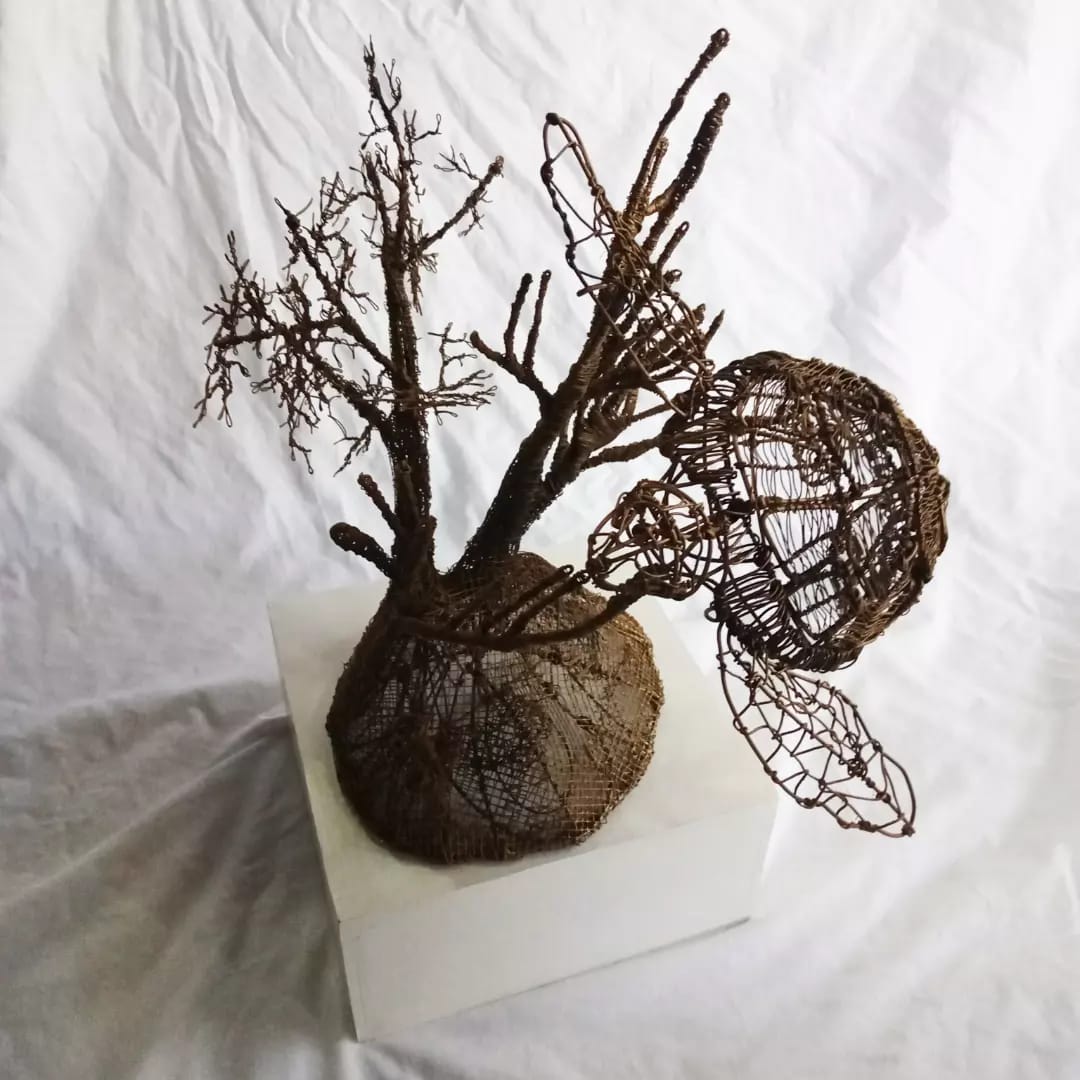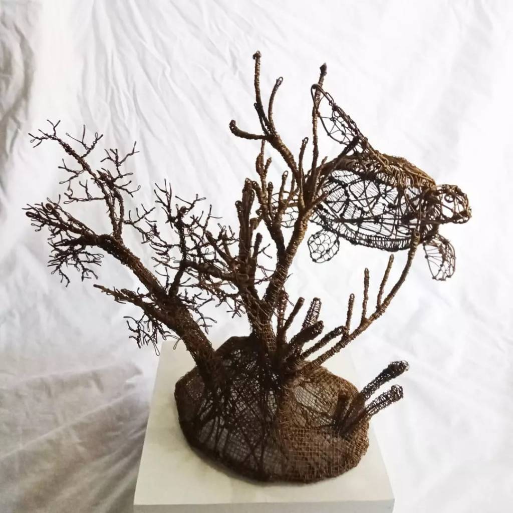 Wire, screens, acrylic epoxy, wooden base. 15.5x16x12.5 inches. 2022.