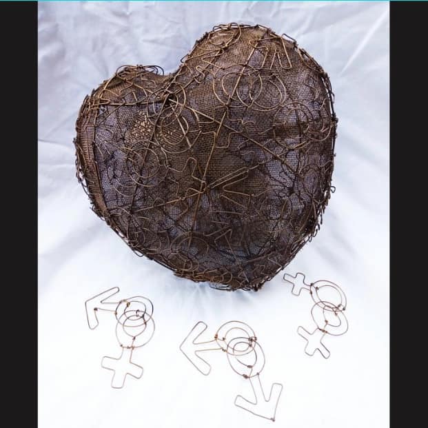 Wire, screens, acrylic epoxy. Heart – 10x6x11 inches. Other elements variable. 2022. For an LGBTQ-themed group exhibit.