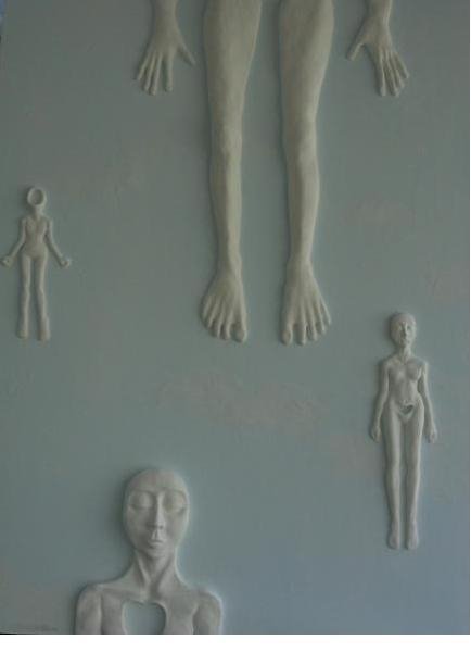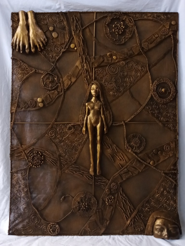 If you notice both works above, there are curved lines and spaces that represent these paths. The mandalas represent meditation (Creating mandalas itself is a meditative practice. This is another activity which I added to my daily routine: A Circle/ Mandala a Day). For the figures, I made multiples of the figures in “Free”, an epoxy relief I made in 2007.