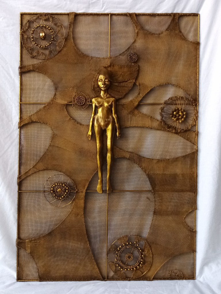PATHS 2: Wire, screens, stainless steel frame, epoxy, assorted beads, automotive paint. 30×40 inches, 2022. Submitted for Figuras 2022, Pinto’s yearend group exhibit.