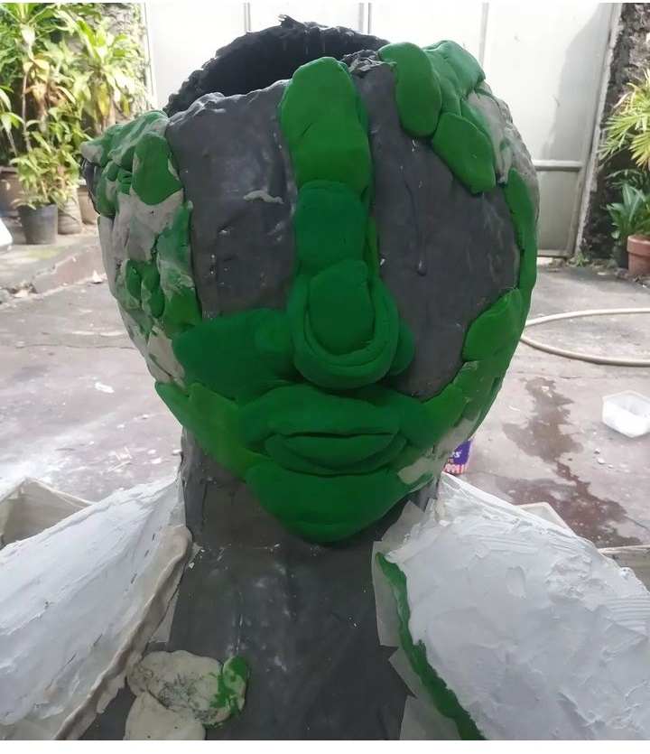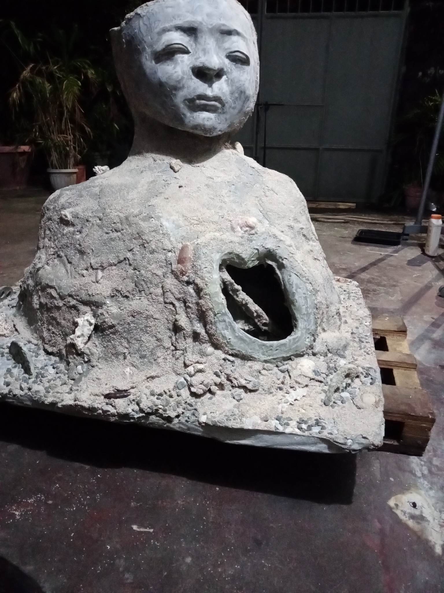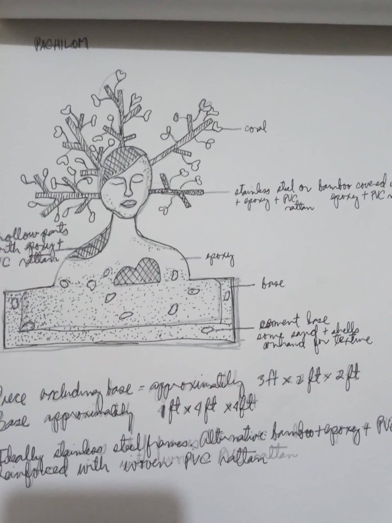 The sea has a soothing, energizing, healing quality. And there is nothing quite like going to the beach to help clear one’s head and drown one’s sorrows. For the piece, “Paghilom”, one sees a figure with a hollow head and heart, representing the mind and/ or heart that need healing. I envision that one day, those parts – the head and the heart – will be filled with coral, eventually making the piece whole (and further down the road, completely covered with coral). When that happens, the piece, in turn, can contribute to the healing of the sea and the flourishing of marine life. (Inside those hollows are rods/ provisions for tying/ attaching the coral fragments. The holes in the half-mandalas surrounding the figure are for the same purpose.)