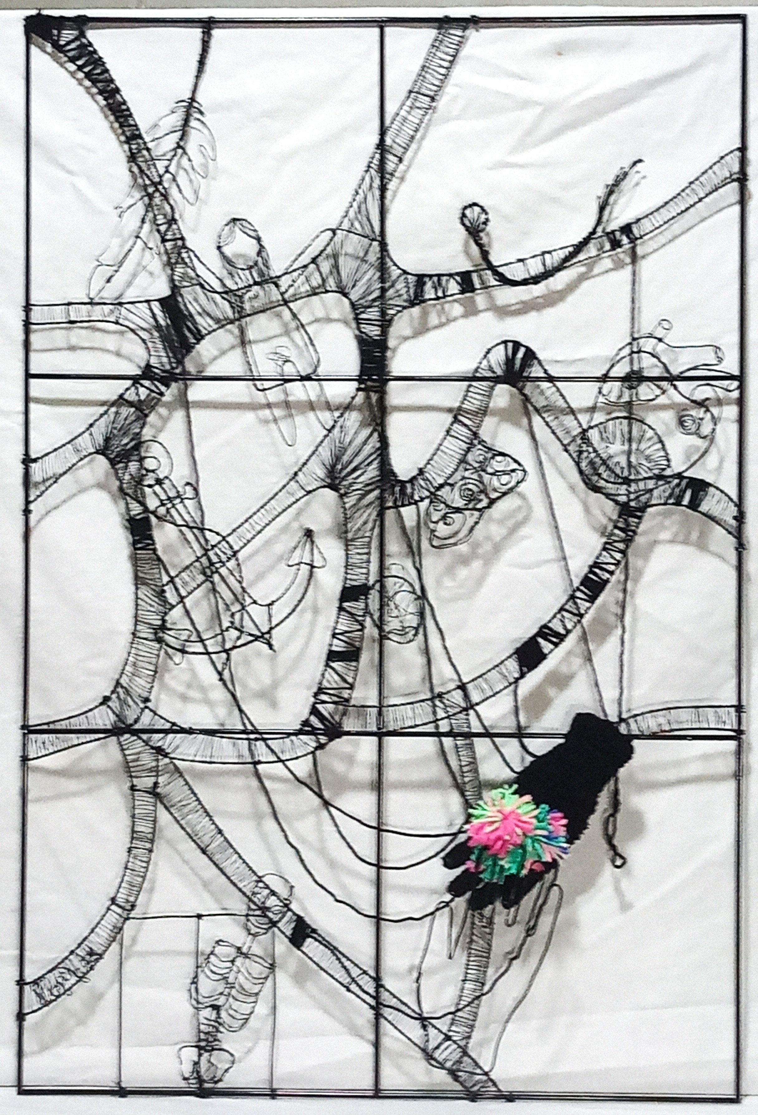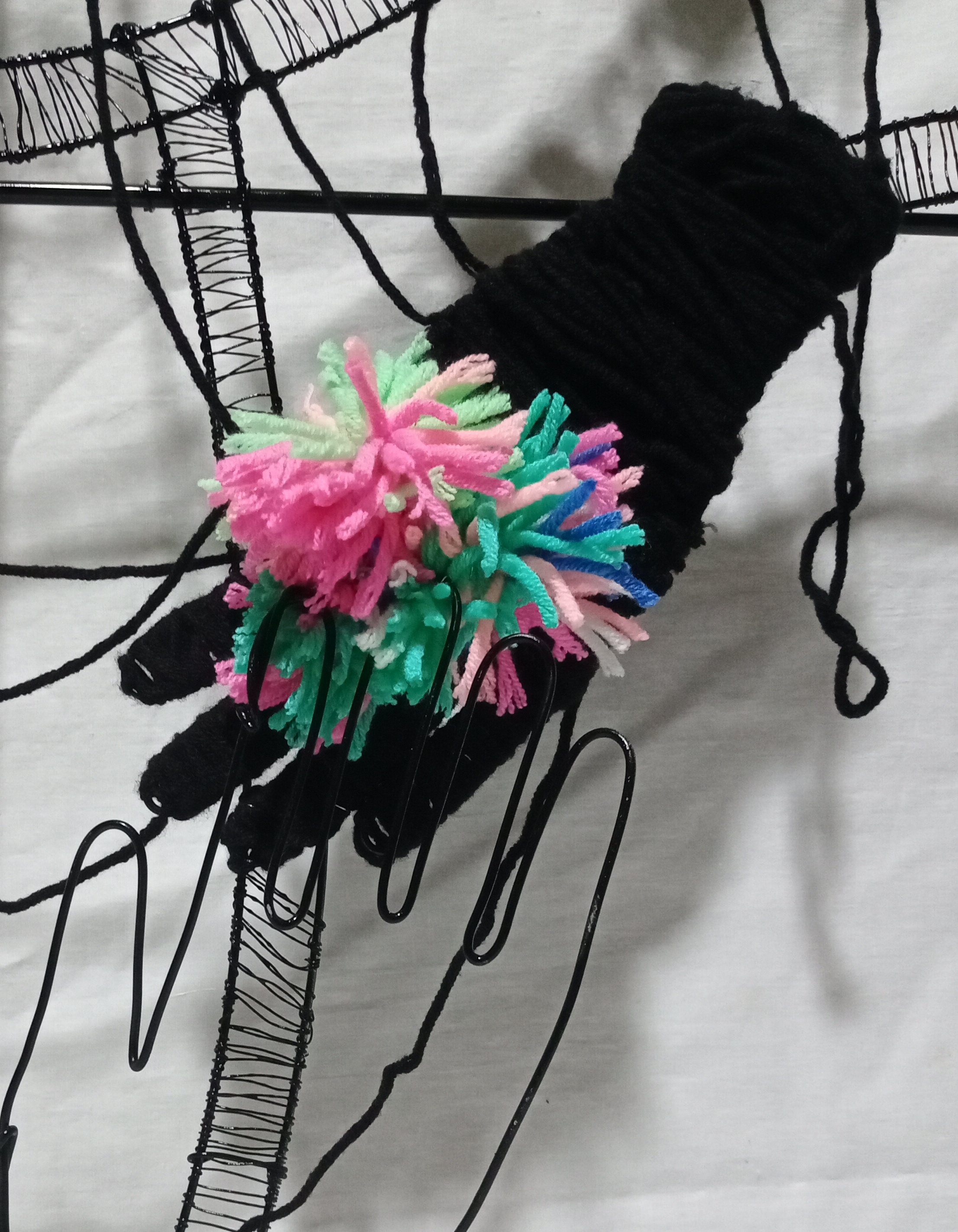 Stainless steel frame, wire, acrylic epoxy paint, yarn