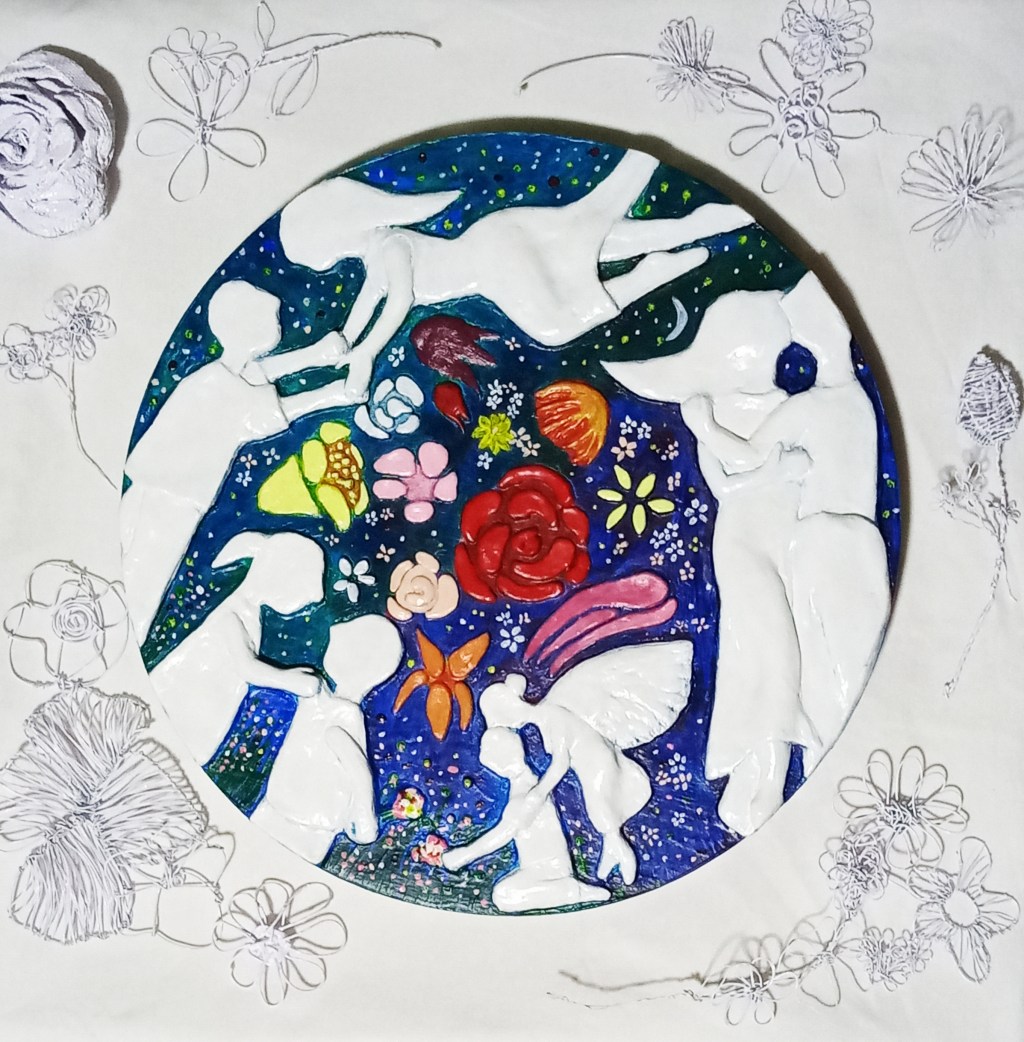 “Where We Start and End”. Artwork for Pinto’s 2024 yearend exhibit, colors of Chagall.